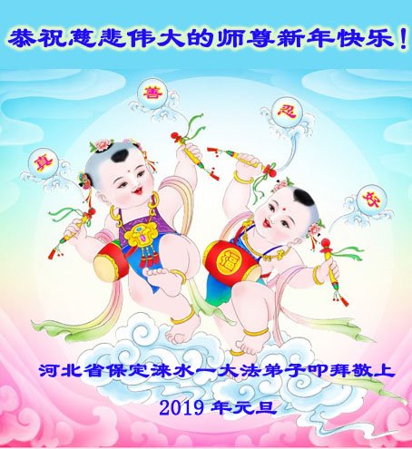 【明慧网二零一八年十二月二十九日】 河北省保定市雄县一学法小组全体大法弟子叩拜恭祝慈悲伟大的师父2019年元旦快乐!