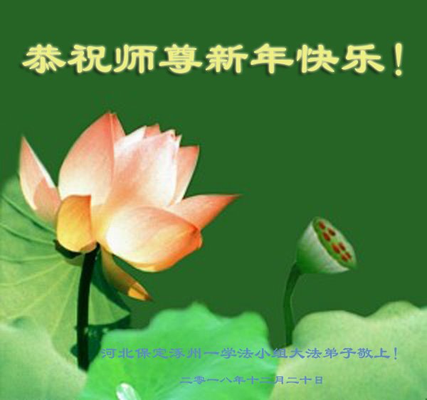 在师尊的慈悲呵护下,我们大法弟子又走过了一年。在新的一年里,我们要一如既往的做好三件事,修自己,向内找,完成好救人的使命!感恩师尊慈悲救度! 恭祝师尊新年快乐! 合十! 河北保定涿州一学法小组大法弟子 二零一八年十二月二十日 河北省保定市涞水一大法弟子恭祝慈悲伟大的师尊新年快乐!
