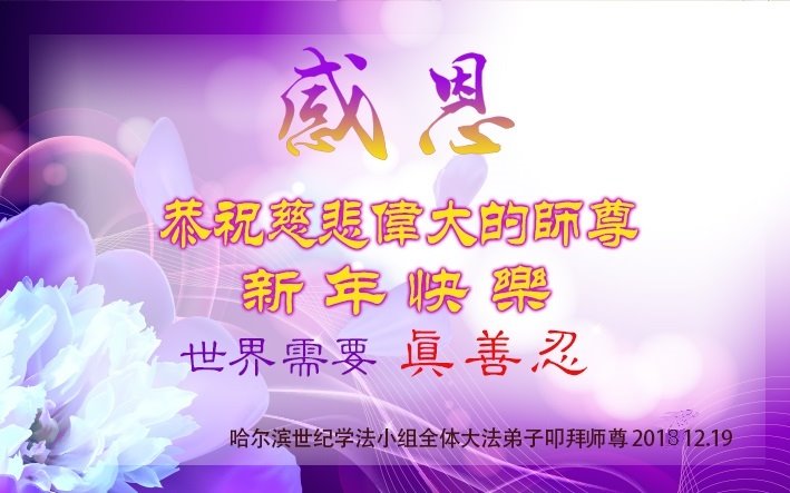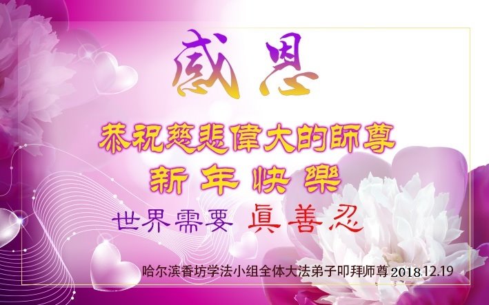 2019年即将到来,过去的一年,弟子经历了一次又一次大关大难,都是在师父的慈悲保护下脱险。在此弟子叩谢师父!我一定不辜负恩师的慈悲苦度,珍惜师父给我的生命,好好修炼自己,溶于法中,多多救人,完成使命。愚徒再次叩谢伟大的师父! 黑龙江省哈尔滨南岗学法小组全体大法弟子叩拜师尊