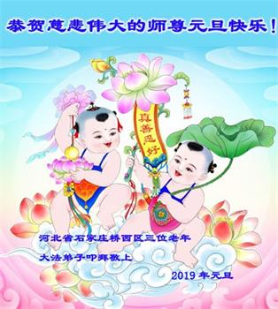 河北省石家庄桥西区三位老年大法弟子叩拜敬上 二零一九年元旦 河北省石家庄桥东裕华区一学法小组大法弟子恭祝慈悲伟大的师尊新年快乐!