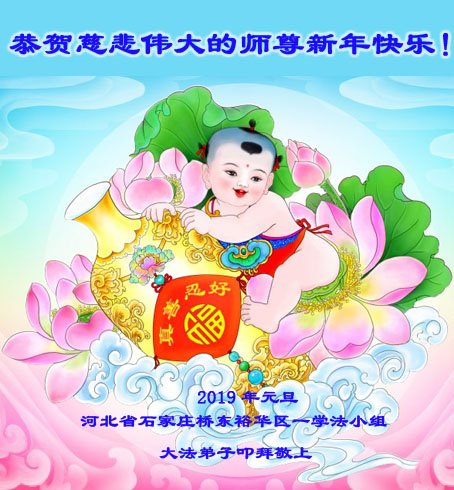 慈悲伟大的师尊,您好:2019新年即将到来,弟子在此携全家人感谢师父,二十多年来,师父给了我们太多太多,用尽人间的语言也表达不出师尊的恩德,只有在最后不多的时间里精進实修,做好三件事,完成史前大愿,跟师父回家。 双手合十,跪拜师尊!恭祝师尊新年快乐! 河北省石家庄裕华区一学法小组全体大法弟子恭祝慈悲伟大的师尊新年好!