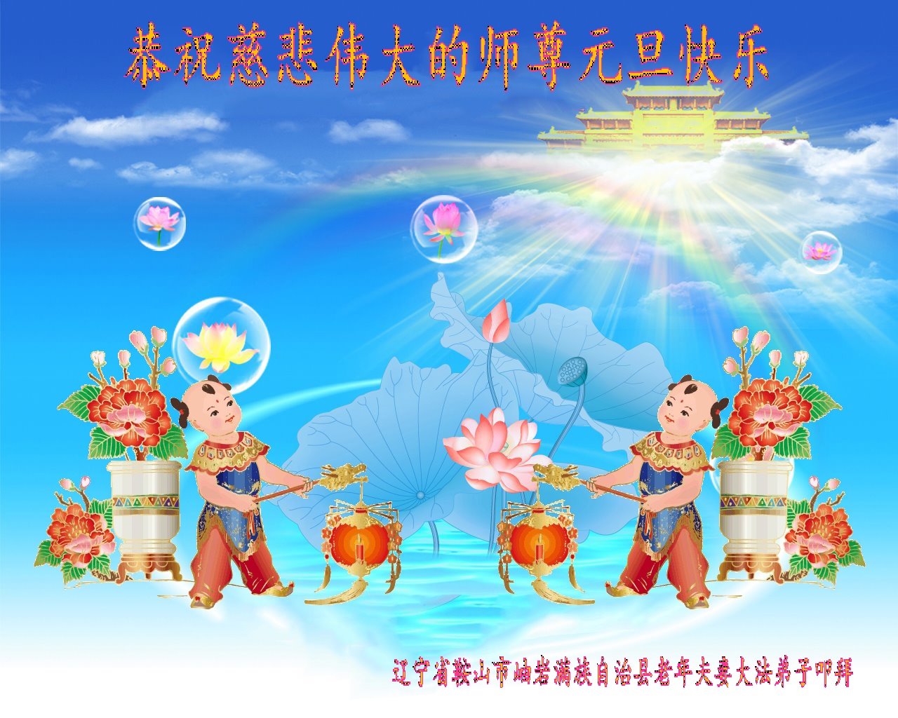 恭祝师尊新年快乐! 轮回转生数千年 主佛救度上法船 新年叩拜谢师恩 牢记使命兑誓言 辽宁八旬弟子夫妻敬贺 辽宁省辽阳市宏伟区大法弟子恭祝师父新年好!
