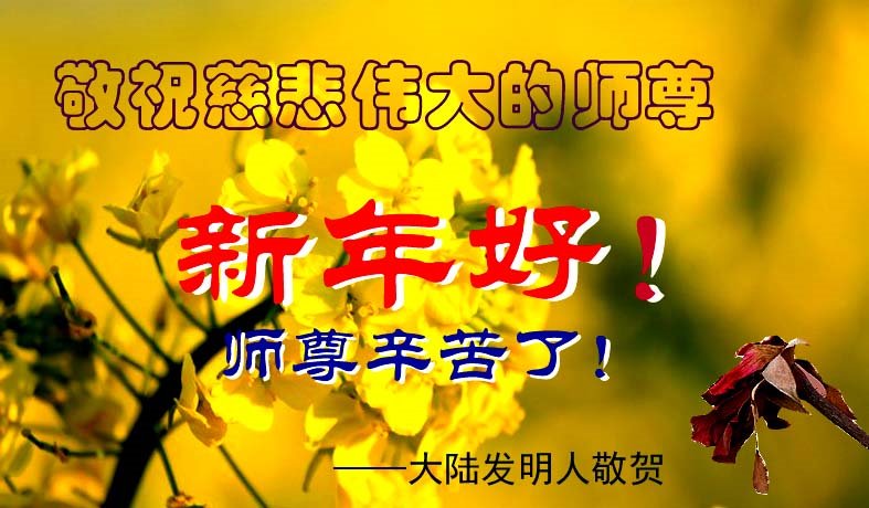 恭祝慈悲伟大的师尊新年快乐! 师父您辛苦了 大陆一学法组全体大法弟子叩拜 中国大陆全体法轮大法弟子恭祝师父新年好!