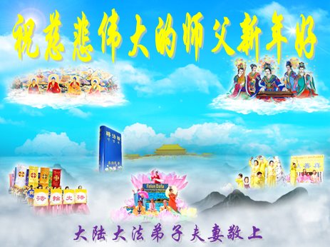师父您好,您辛苦了!弟子以后要多学法、学好法,跟师父回家。 叩拜师父! 大陆大法弟子夫妻敬上 大陆觉醒民众恭祝大法师父新年好!