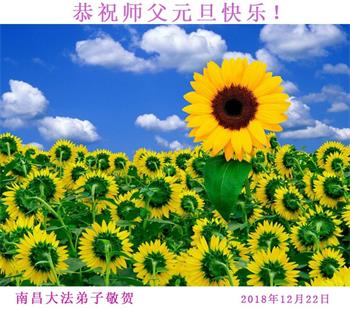 在二零一九年元旦即将来临之际,唐山大型国企大法弟子恭祝师尊新年好!虽远隔重洋,却挡不住弟子们对师尊的感恩和思念!弟子在此遥拜,道一声:师尊您辛苦了!弟子们谢谢您! 江西南昌一国企大法弟子恭祝师父元旦快乐!