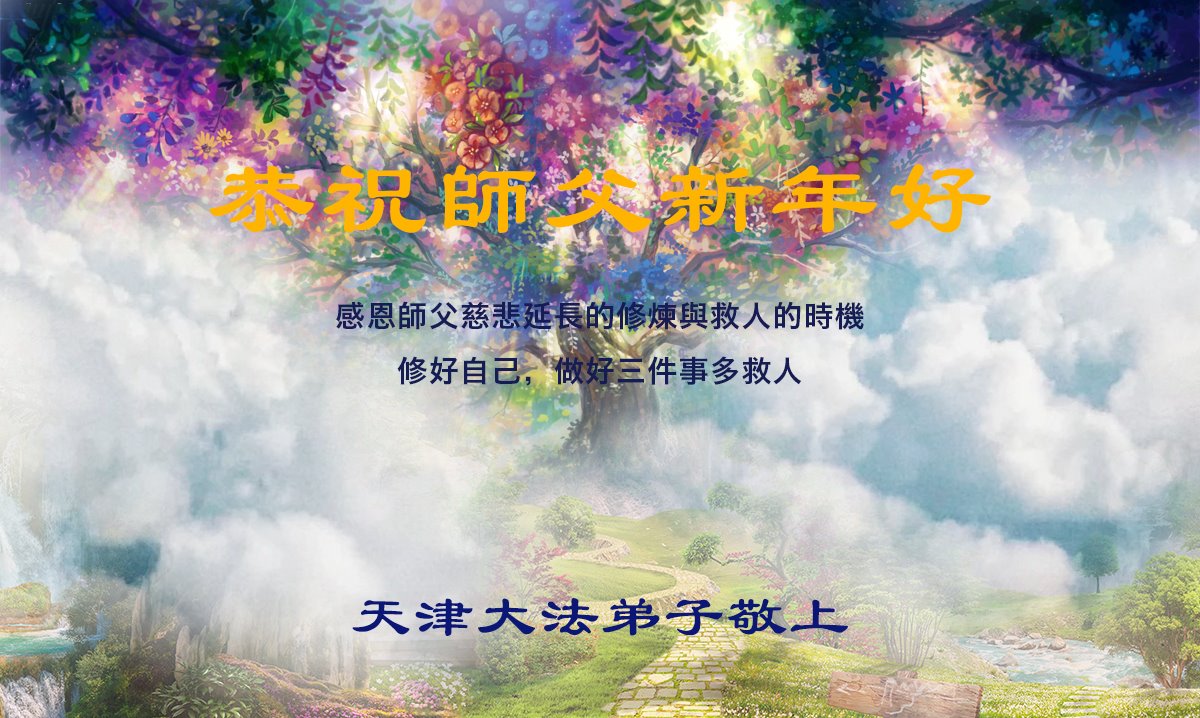 慈悲伟大的师父谢谢您!谢谢师尊慈悲苦度!谢谢您洪恩浩荡!弟子用千言万语无法表达对师尊的感恩,在师尊以最大的承受延续来的时间,努力学好法,做好三件事,遇事向内找,实修自己,修好自己,快救人、多救人,达到标准,跟师父回家。滨海塘沽大法弟子叩拜! 天津市一老年学法小组大法弟子及家人恭祝慈悲伟大的师尊新年好!