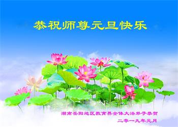 湖南省岳阳地区教育界全体大法弟子敬祝慈悲伟大的师尊二零一九年元旦快乐!全体大法弟子都要用心做好三件事,修好自己多救人。 大陆教育界大法弟子恭祝师尊新年好!