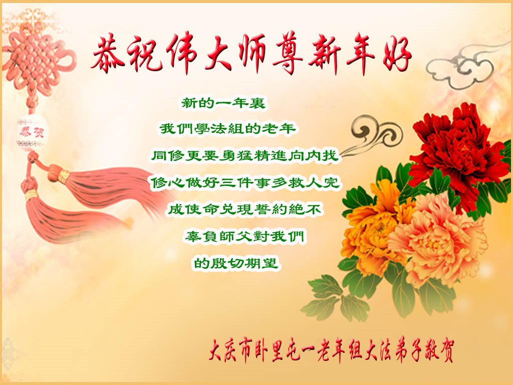 新的一年里,我们学法组的老年同修更要勇猛精進,向内找,修心,做好三件事,多救人,完成使命兑现誓约,绝不辜负师父对我们的殷切期望。 黑龙江省大庆市夫妻大法弟子恭祝师尊新年快乐!