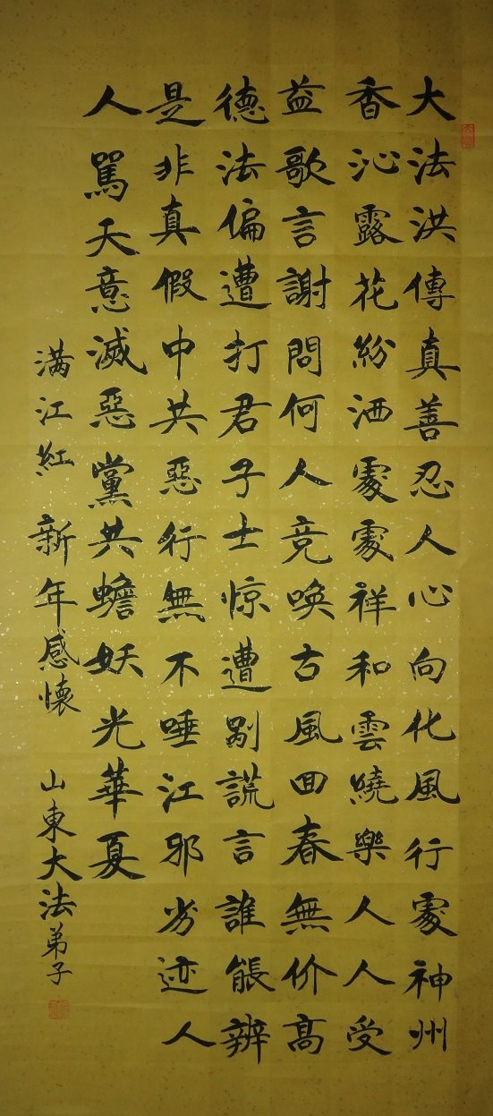 满江红·新年感怀 大法洪传,真善忍,人心向化。风行处,神州香沁,露花纷洒。处处祥和云绕乐,人人受益歌言谢。问何人、竟唤古风回,春无价? 高德法,偏遭打。君子士,惊遭剐。谎言谁能辨,是非真假?中共恶行无不唾,江邪劣迹人人骂。天意灭、恶党共蟾妖,光华夏。 山东大法弟子跪拜! 山东烟台一大法弟子恭祝师尊新年好!