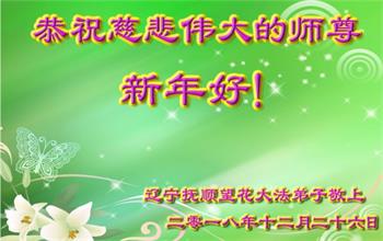 恭祝慈悲伟大的师尊新年好! 二零一八年匆匆的走了,弟子们在师尊的保护下,经受住了巨大的打击,同时体会到修炼的严肃,弟子们会严守修炼人的标准,做好三件事,助师正法,救度更多的众生。 辽宁抚顺母女二人大法弟子敬上 二零一八年十二月二十六日 辽宁抚顺望花大法弟子恭祝慈悲伟大的师尊新年好!