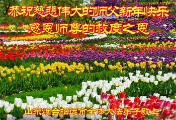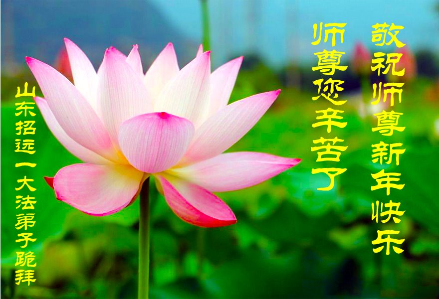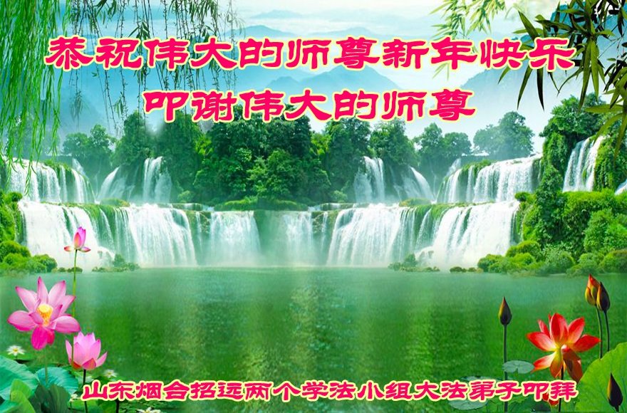 师尊您好!师尊您辛苦了! 新年来到之际,弟子非常想念远在大洋彼岸的师尊。盼早日能和师尊见面。 弟子无法表达对师尊的感恩之心,只能在今后有限的时光中,做好大法弟子应该做的三件事,把还没有去掉的人的执着尽快去掉,扎扎实实的走好每一步,达到标准,不辜负师尊的慈悲苦度。 弟子跪拜师尊! 山东烟台招远市全体大法弟子恭祝慈悲伟大的师尊新年好!