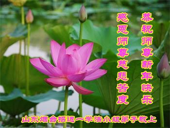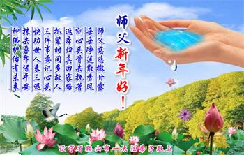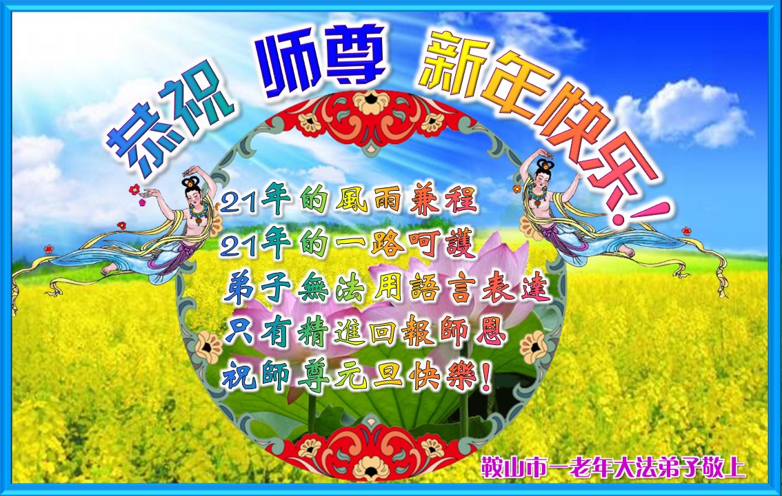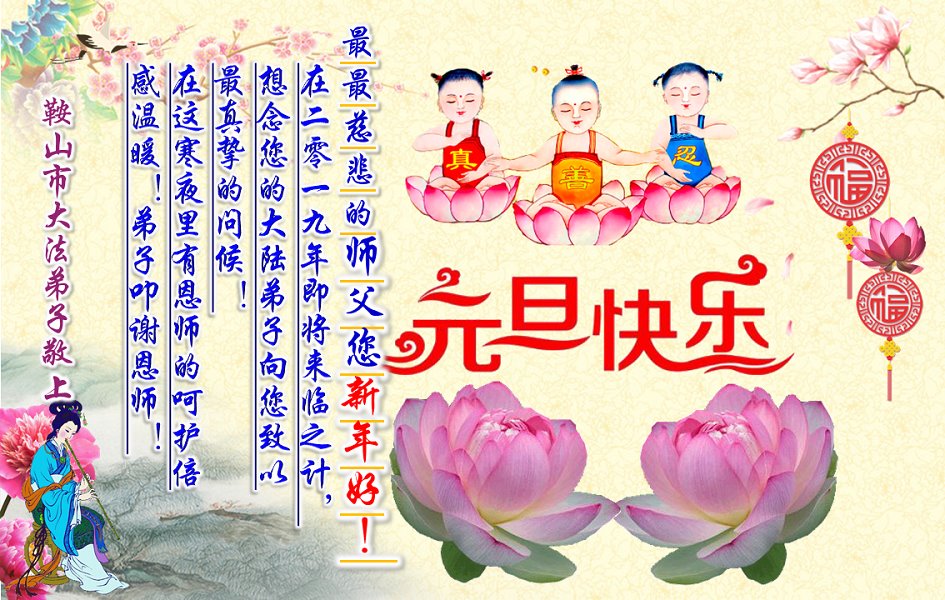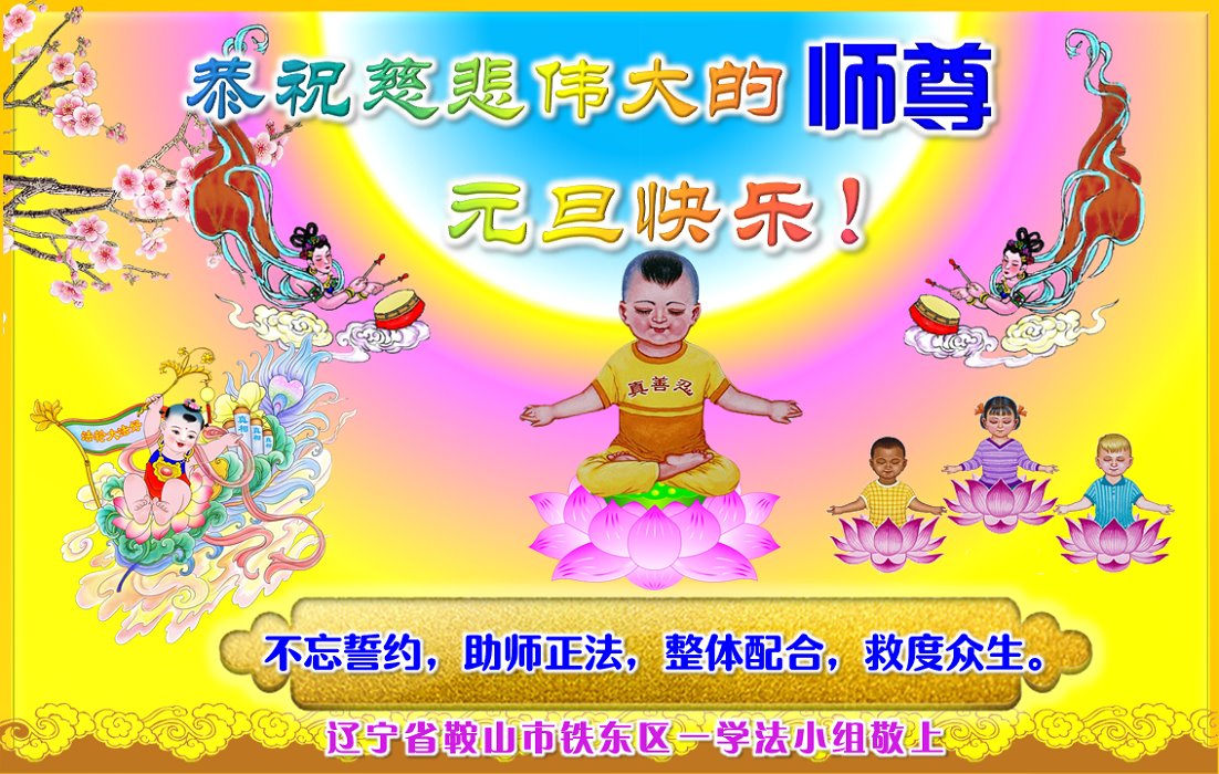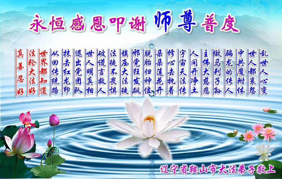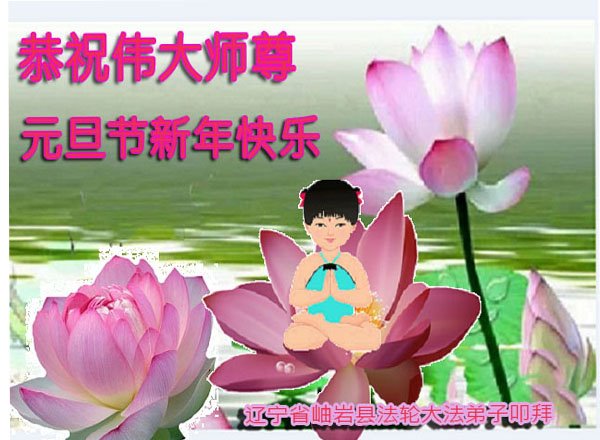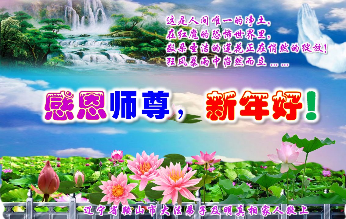 这是人间唯一的净土, 在红魔的恐怖世界里, 数朵圣洁的莲花正在悄然的绽放! 狂风暴雨里岿然而立…… 慈悲的师父啊,我的师尊, 弟子感谢您将我从人间地狱中捞起, 二十多年的风雨中保护着弟子, 让弟子不断的升华不断的成熟! 真、善、忍的法理已经生根! 您给予弟子的太多太多, 弟子无法用语言表述。 在新的一年即将到来之际, 弟子向师父道声辛苦了! 师父祝您新年快乐! 唯有精進报师恩! 辽宁省鞍山市大法弟子及明真相家人敬上 辽宁省鞍山市铁东区一学法小组大法弟子恭祝师尊新年快乐!