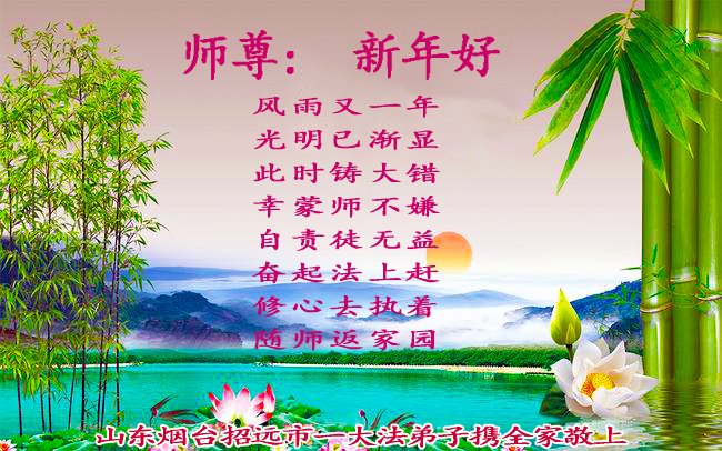 风雨又一年 光明已渐显 此时铸大错 幸蒙师不嫌 自责徒无益 奋起法上赶 修心去执着 随师返家园 山东烟台招远市一学法小组大法弟子敬贺师尊新年快乐!