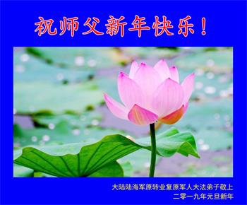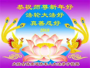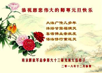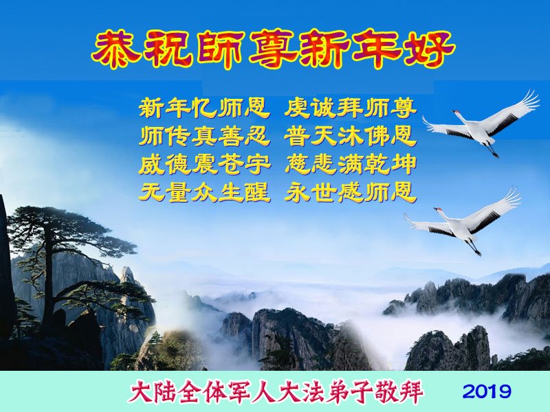 | 【明慧网二零一八年十二月三十一日】在二零一九年新年即将来临之际,中国现役军人、国防军工、兵工系统、南京解放军总参第63研究所、军队医院、空军干休所、国防大学、多省陆海军转业军人大法弟子,以及任职于司法、公安、政法系统、法院、法官行业、省政府办公厅、省、市政府机关、公务员系统的法轮大法弟子,给李洪志师父发来贺信,恭祝师父新年好! 来自北京某空军干休所、国防大学的北京大法弟子在贺信中说:“我们都是7.20以前得法修炼的,年龄最大的87岁,最小的50岁,大法之圣缘把我们紧紧连在了一起。跟随您走过二十多年的正法之路,我们越来越成熟了,能够成为正法时期大法弟子我们感到无比自豪。” 空军现役、复转官兵大法弟子在给师父的贺词中写道:“我们从得大法修炼的那天起就发誓:紧随师父,一心修炼到底!这既是誓约,也是使命。兑现誓约,我们义无反顾。” 江苏省政法系统大法弟子赋诗一首: “镇邪灭乱乾坤震 正念除恶恶灭尽 天清体透寰宇清 法正人间宙宇新” 山东省省政府机关大法弟子问候师尊新年快乐!“我们大家非常想念您,我们在做好三件事的同时,期盼与师父团聚的那一天早日到来。” 大陆法院系统大法弟子恭祝师父新年好!