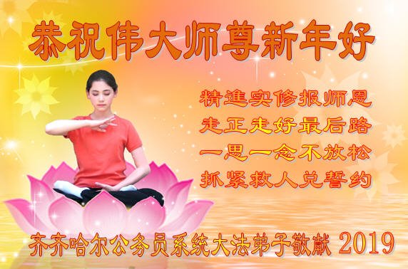 弟子一定要做好三件事,少让师父操心,感恩师父的慈悲救度,盼望师父早日回到家乡,弟子们想念师父,拜谢师恩。 黑龙江省齐齐哈尔市公务员系统大法弟子恭祝慈悲伟大的师尊新年快乐!