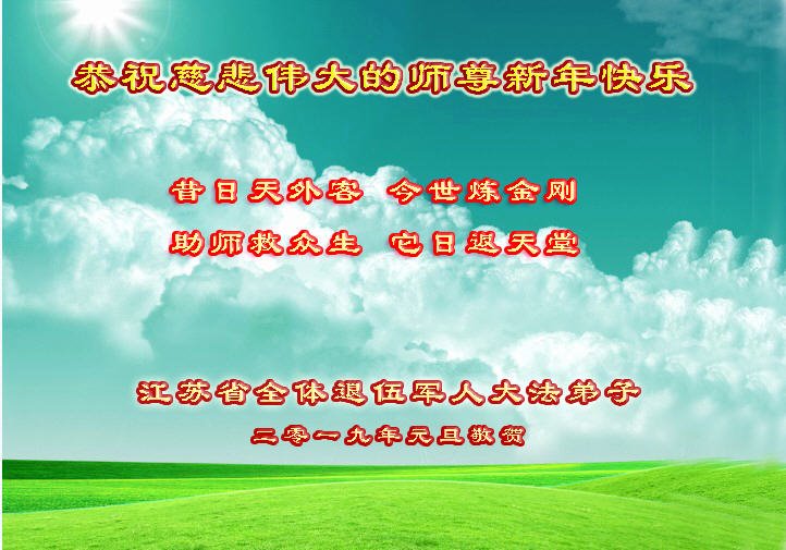 在新的一年里牢记师尊教诲:向内找修好自己;讲清真相救度众生,完成使命。 北京空军某大院及周边大法弟子叩拜师尊 2018年12月22日 江苏省全体退伍军人大法弟子恭祝慈悲伟大的师尊新年快乐!
