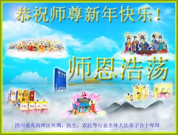 大陆乡村城市一家族大法弟子及被非法关押在囹圄的俩大法弟子恭祝慈悲伟大的师尊新年好!新年快乐! 四川南充高坪区丝绸、医生、农民等行业全体大法弟子合十,叩拜恭祝师尊新年好!新年快乐!您辛苦了!
