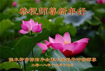 师尊您好!弟子在此遥祝您新年快乐! 您历尽艰辛洪传大法救苍生,我们今生能得法修炼,成为大法弟子中的一员,真是三生有幸。在此,我们夫妻叩谢您的救度洪恩! 是您无处不在的慈悲,让恶魔胆寒;是您的力挽狂澜法力,才铸就了苍宇的辉煌。 我们坚信师父,坚定大法修炼,正念解体邪恶,多救人,做好我们弟子该做的事,不愧对“正法时期大法弟子”这宇宙第一称号,肩负责任,不辱使命,圆满随师返家园。 黑龙江佳木斯佳东百隆学法小组大法弟子恭祝师尊元旦快乐!