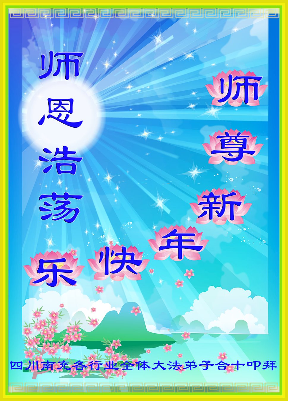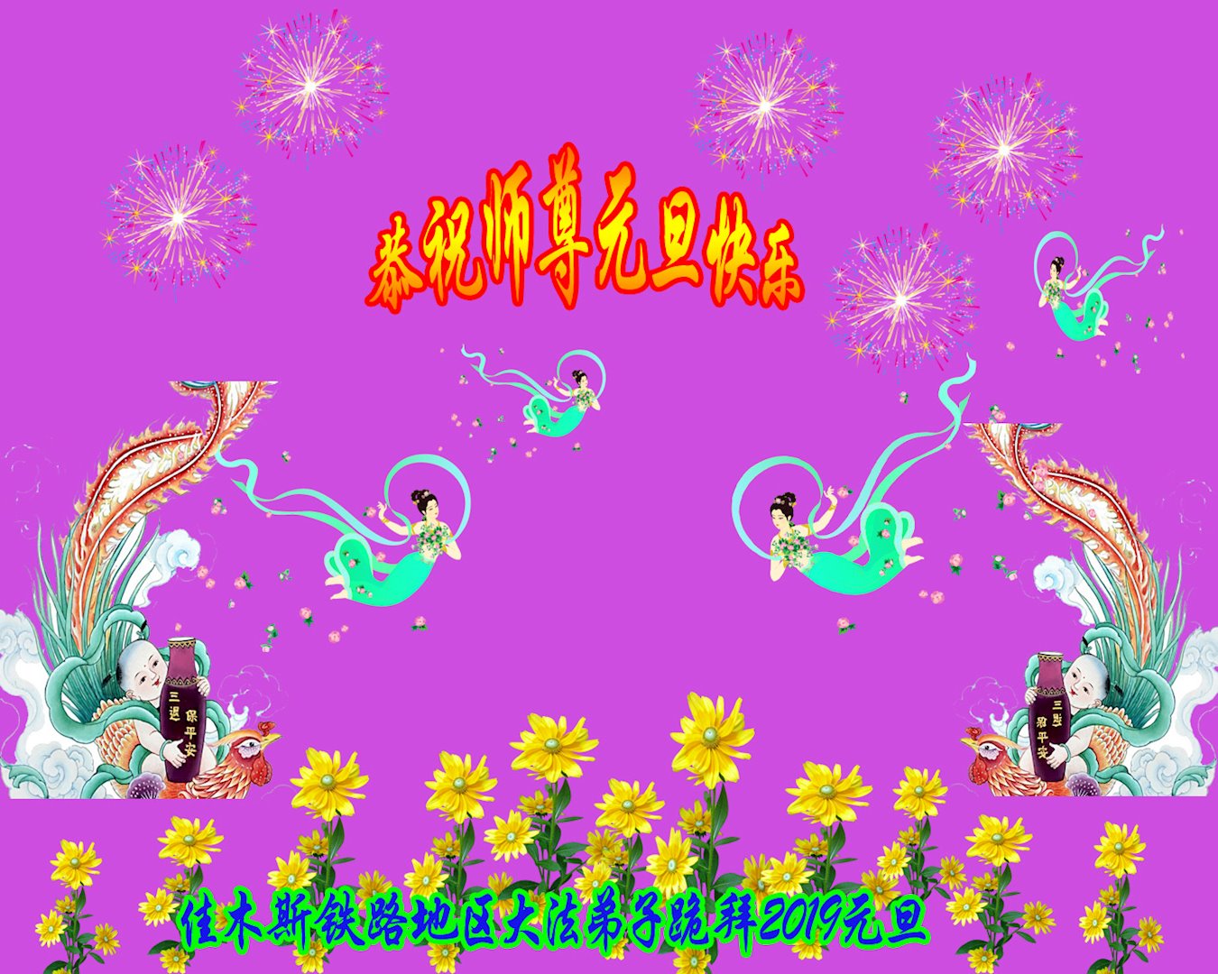 黑龙江省北安市通北林业局大法弟子代表全家向慈悲伟大的师尊恭贺新年!祝师尊新年快乐!师尊您辛苦了!弟子唯有努力精進,做好三件事以报师恩! 四川省达州市开江县卫生系统全体大法弟子恭祝师尊新年愉快!
