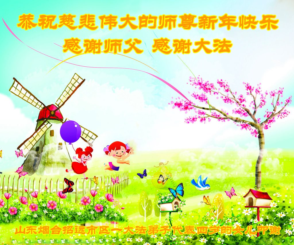 在新年来临之际,弟子与家人恭祝师父新年好!师父您辛苦了! 在这正法最后的时间里,弟子一定要多学法,学好法,做到真修实修,珍惜机缘,正念正行,做好三件事,圆满随师还。 感恩师尊慈悲救度!感恩师尊的保护!我们一家沐浴在大法的慈悲救度之中。谢谢师尊!祝愿师尊新年快乐! 合十敬拜! 山东烟台招远一大法弟子代表四岁的女儿恭祝伟大的师尊新年快乐!