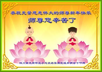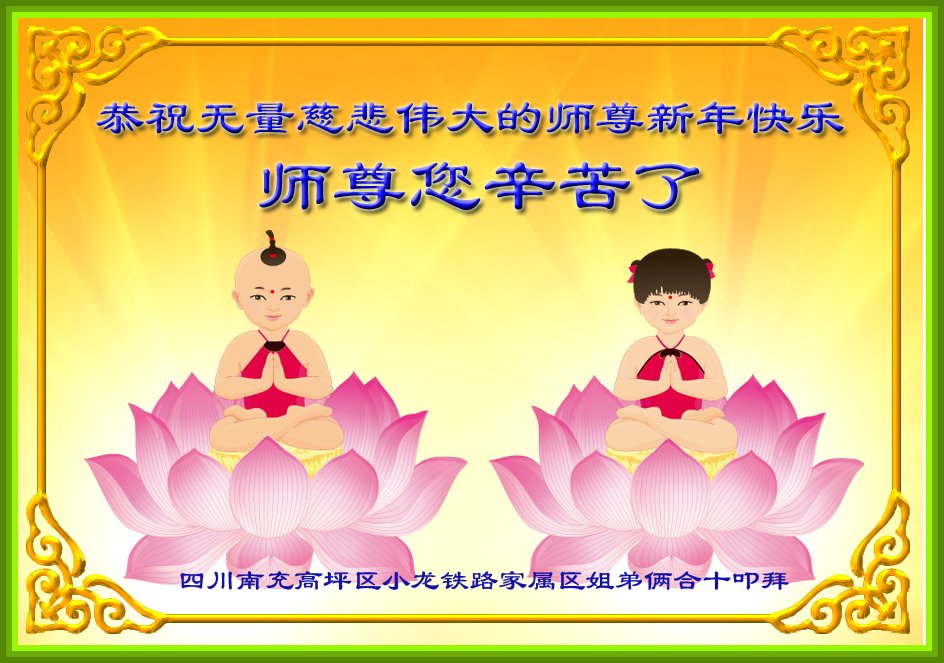 恭祝无量慈悲伟大的师尊新年快乐!师尊您辛苦了!感恩师尊赐给我们法轮大法!感恩师尊净化了我们的身心,让我们在法轮大法这一片净土中健康快乐!的成长,知道了生命的真谛和为别人着想的快乐!四川南充高坪区小龙铁路家属区姐弟俩合十叩拜! 辽宁省大连机车厂大法弟子恭祝慈悲伟大的师尊元旦快乐!