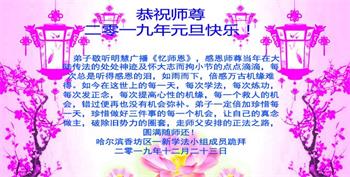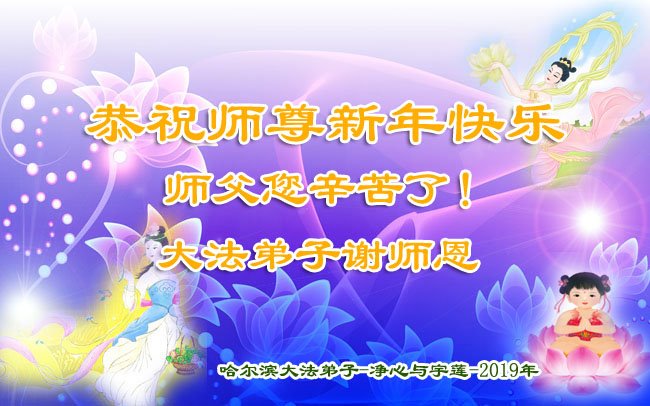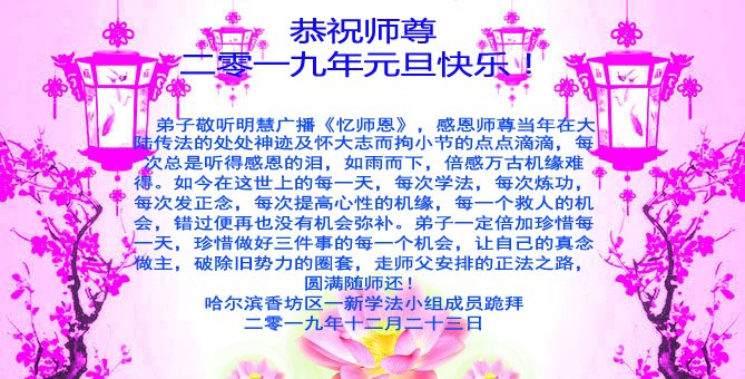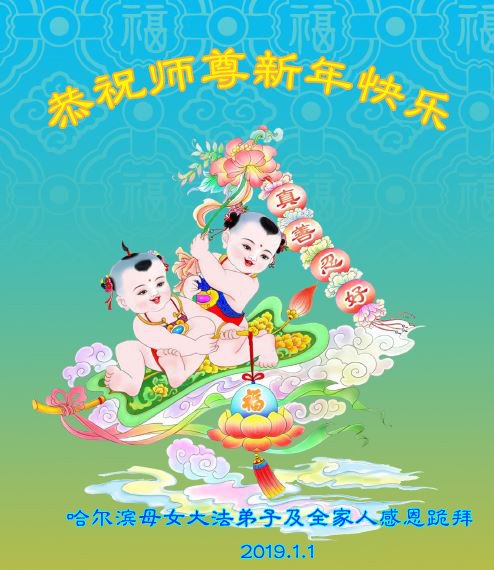 2018年过去了,迎来了2019年,弟子在大法中修炼了13年千言万语也无法感恩师尊的无量慈悲。在此新年来临之际弟子跪拜师尊新年快乐! 弟子知道现在的每一天是慈悲的师尊用巨大的承受才换来了众生得救的机会。弟子新的一年一定努力学好法,突破人的观念做好三件事,在讲清真相中做的更好,不负师尊的慈悲救度。 黑龙江省哈尔滨市双城市区一家老少三代四位大法弟子祝师父新年快乐!