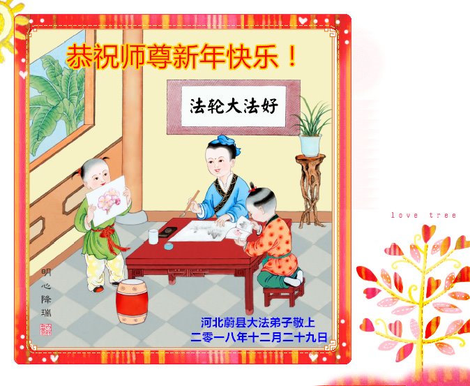 人生千载轮回,幸遇师尊救起。助师正法了愿,返本归真回归。 河北省张家口市蔚县大法弟子恭祝师尊新年快乐!