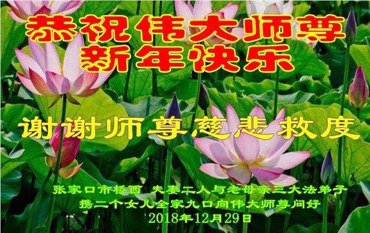 祝慈悲伟大的师尊新年快乐! 感恩师尊慈悲救度保护 张家口沽源母女二大法弟子携全家向伟大的师尊问好 ! 河北省张家口地区全体大法弟子祝慈悲伟大的师尊新年快乐!