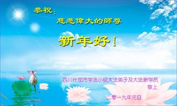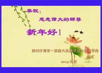 2018年在师尊的慈悲保护下,在三月、九月、十一月,我的老公公、娘家母亲和我先生相继得法修炼,至此家口共有六位修炼人,感恩师尊慈悲救度,我们一定带好新学员,做好三件事,兑现誓约圆满随师还。在此,全家恭祝师尊新年快乐! 重庆大法弟子恭祝师父新年快乐!