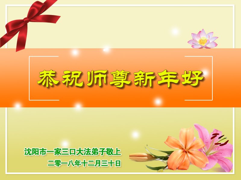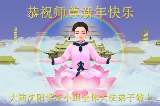 师尊辛苦了!谢师尊多少年的慈悲苦度,谢师尊用巨大的付出为弟子延续了修炼的机缘和时间,弟子们才有了今天:即将得道回天、功成圆满!谢师尊传大法、救众生,才有了宇宙更新、乾坤归正、天清体透、永永远远。 师尊!我们无法感谢您的佛恩浩荡,仅在此代表学法小组的大法学员恭祝师尊新年快乐!代表我的全家恭祝师尊新年快乐! 辽宁大法弟子 辽宁省沈阳大法弟子恭祝师尊新年好!