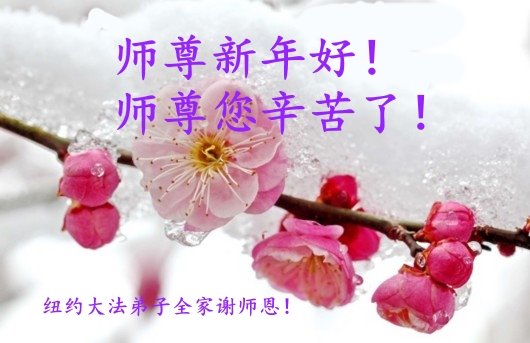 大法弟子全家给慈悲伟大的师尊恭贺新年: 师尊新年好! 师尊您辛苦了! 纽约大法弟子全家谢师恩! 纽约英文大.纪.元;全体大法弟子恭祝慈悲伟大的师尊新年好!