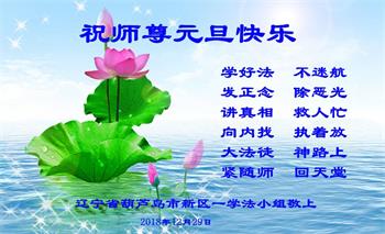 师尊您好!您辛苦了!新的一年将要来临,弟子转述讲真相过程中,明真相众生的问候:“大法师父新年好!”! 我们家庭小整体,二十多年来沐浴在佛恩浩荡中,互相配合圆容整体,做着弟子们应该做的,这是我们的责任。正法中不谈个人感受、不计较个人得失、不讲条件,在法中修出的慈悲,善待所有的生命。 助师正法是弟子们的无上荣耀,新的一年弟子们在兑现誓约中,展现正法时期大法弟子的风采,越到最后越精進,回报师尊给予的所有。 叩拜师尊!合十 辽宁省葫芦岛市一家三位大法弟子敬上 一年一度的新年即将到来,我们辽宁省葫芦岛市连山区化机街全体大法弟子敬祝慈悲伟大的师父新年好!