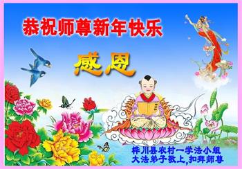 历经艰苦的修炼、残酷的迫害,在师尊的保护和大法的指导下,我们农村大法弟子现在也越来越成熟,每个人都在开创自己的修炼环境,利用自身条件做好三件事,积极向内找,消除彼此的间隔,形成一个更有力整体,救度这一方众生,以望不辜负师尊的救度和众生的期盼!叩谢师恩!师父辛苦了! 山东省潍坊市农村大法弟子恭祝师尊新年快乐!