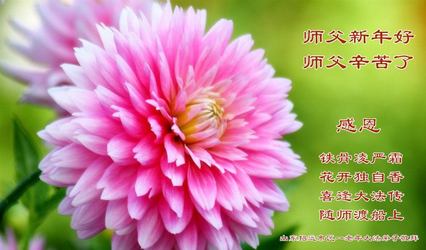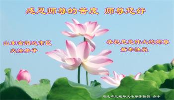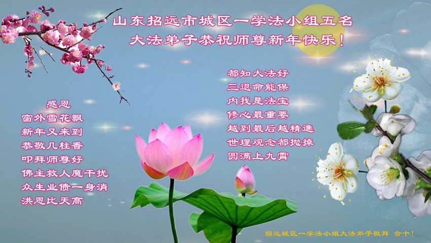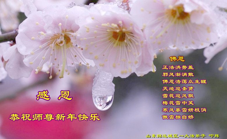 师尊您好! 恭祝师尊新年好!新年快乐! 感谢师尊救度之恩。 山东冠县大法弟子敬上。 山东省烟台市福山区一学法小组的大法弟子恭祝慈悲伟大的师尊新年快乐!