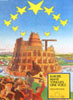 这个巴比伦通天塔还出现在欧盟的官方广告标语中(下图),因为很多基督徒认为这些倒立的五角星代表魔鬼撒旦,所以很多人反对欧盟这个广告牌,这个广告标语最后被迫取消。  欧盟印的官方广告牌中有巴比伦通天塔(因人们反对而取消) |