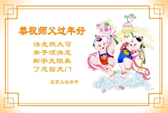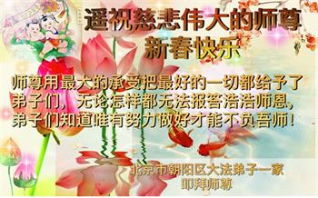 师父过年好!在这里向您表达我们的心声:感谢师父一路保护!我们唯有修好自己,做好三件事,报答师恩,跟师父回家。 北京整体大法弟子恭祝师父新年好!