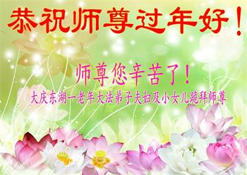 黑龙江省大庆东湖一老年大法弟子夫妇及小女恭祝师父过年好!
