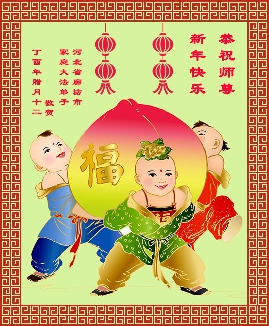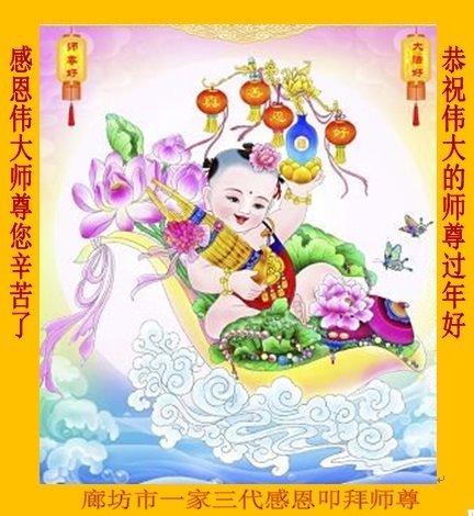 师父新年好!在您的洪大慈悲和呵护中,又迎来了新的一年。我们一定不辜负您用巨大承受换来的宝贵时间,珍惜这万古机缘。努力做好三件事,跟师父回家! 河北省廊坊市大法弟子携家人恭祝师尊过年好!