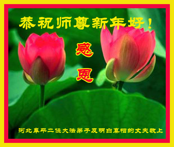 新年佳节到 春风暖人心 生生为等法 来世传福音 今日为此约 踏上正法路 法徒救众生 叩拜师尊恩 河北阜平二位大法弟子及明白真相的丈夫恭祝师尊新年好!