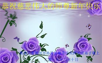 师父新年好!师父辛苦了,弟子万分感谢您救度之恩,万分感谢师尊保护,今后一定严格要求自己去执着心,努力做好三件事,做师父合格弟子。在新的一年里,做好三件事,不执着时间,多救众生,完成史前大愿,跟师父回家。 黑龙江省黑河市孙吴县一夫妻大法弟子恭祝慈悲伟大的师父新年快乐!