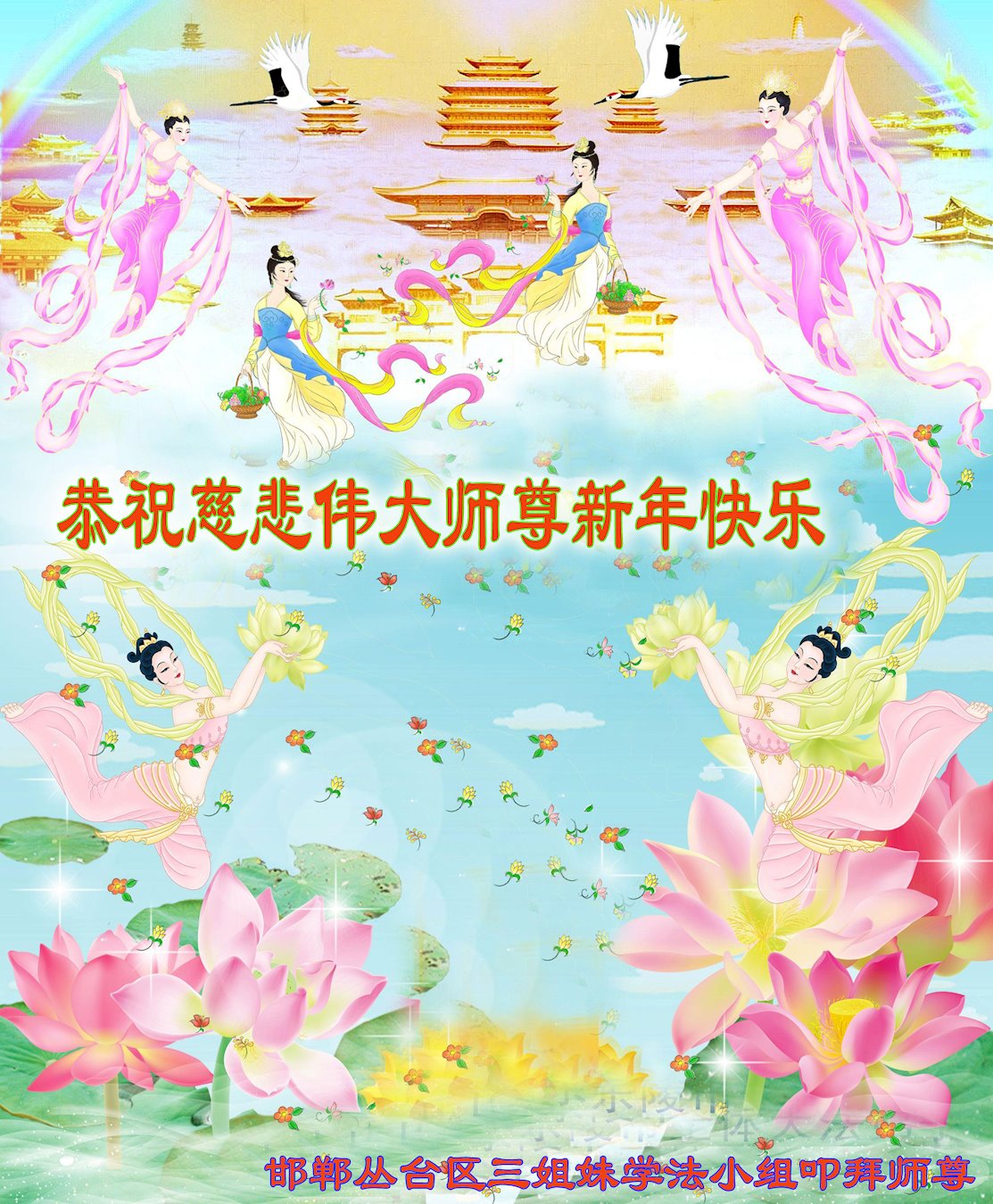 慈悲伟大的师父您好!您辛苦了!感恩师尊慈悲救度。弟子坚修大法紧随师,助师正法,做好三件事,圆满随师还。 河北省邯郸市丛台区三姐妹大法弟子恭祝师尊新年快乐!