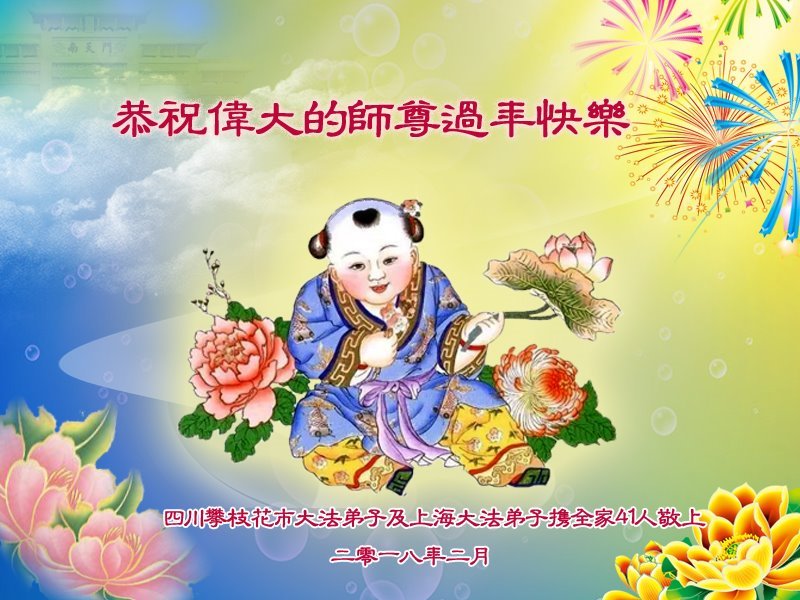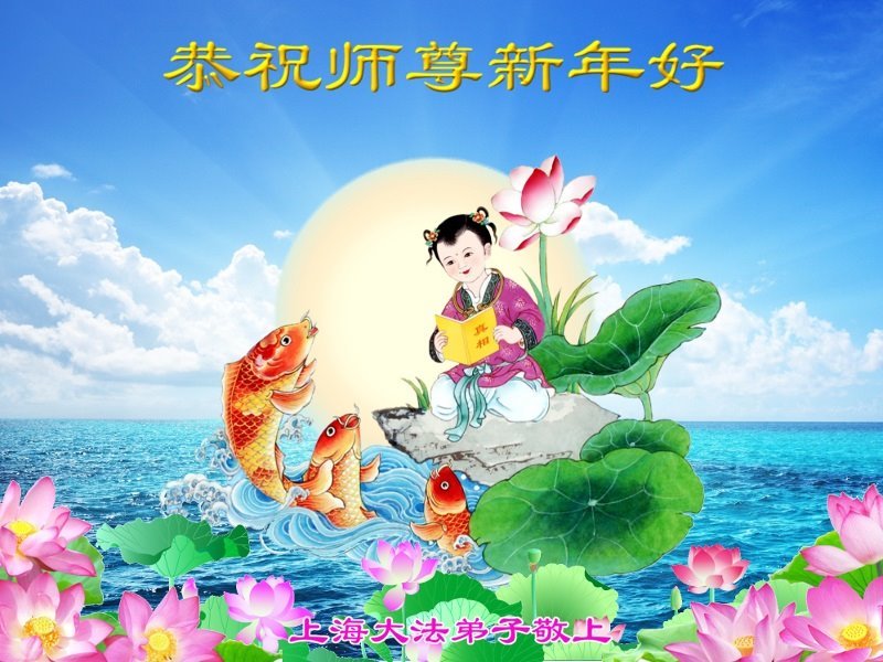 慈悲伟大的师尊:新年好! 上海市浦东新区一大法弟子和儿子一起恭祝师尊新年快乐!师尊我们想念您! 上海一学法小组大法弟子恭祝师尊新年快乐!