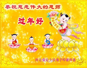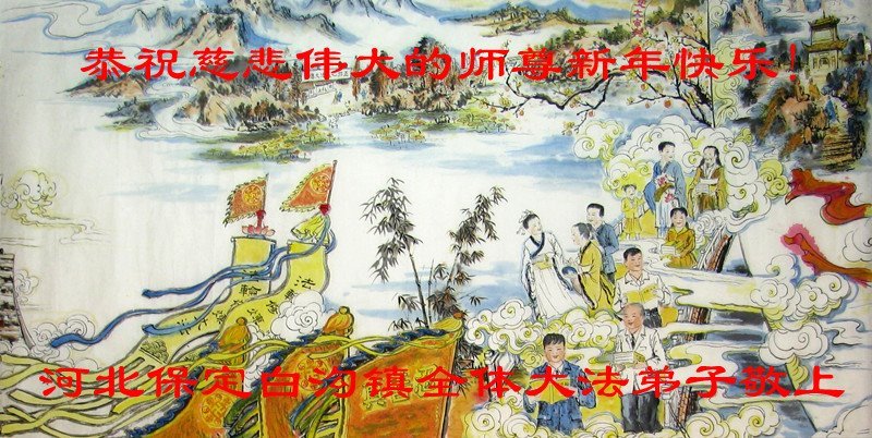 谢谢师尊的慈悲保护,是师尊给了我第二次生命。我一定坚定正念,助师正法,做好三件事,跟恩师回家。 祝师尊新年快乐!: 河北保定市地区 大法弟子 河北保定市高碑店市全体大法弟子给慈悲伟大的师尊拜年!