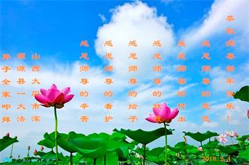 恭祝伟大的师尊新年快乐!千言万语诉不尽师父的救度之恩,感谢师父的一路保护,弟子一定听话,做好三件事,圆满随师父回家。 山西晋城一个大法弟子 二零一八年二月五日 山西大法弟子恭祝慈悲伟大的师尊新年好!
