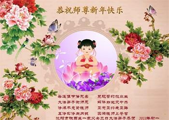 师父过年好!师父您辛苦了! 转瞬又一年,您为了大法弟子、为了众生,一再延长正法结束的时间,给了我们不争气大法弟子一次又一次的机会,为的是什么?为的就是让我们讲清真相,叫更多的世人得救,因此我们全体大法弟子在新的一年里,一定学好法修好自己,发正念清邪恶,讲清真相,叫更多的世人得救,圆满随师还。 辽宁省沈阳市康平县全体大法弟子恭祝伟大的师父过年好!