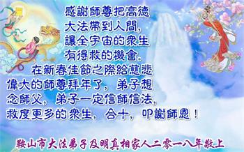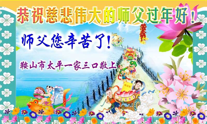 恭祝慈悲伟大的师尊过年好!盼望师尊早日回大陆,感谢伟大师尊救度! 辽宁省鞍山市营救小组大法弟子恭祝师尊过年好!