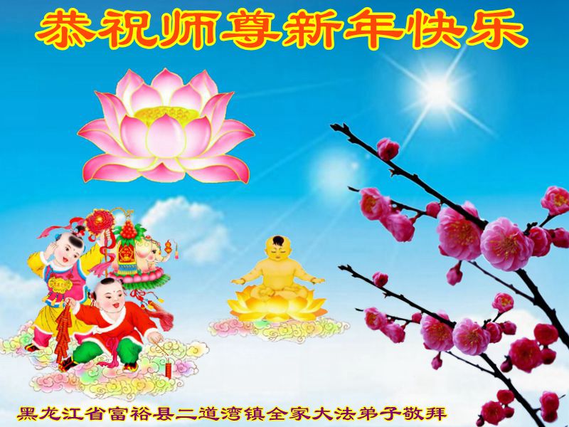 【明慧网二零一八年二月十三日】 黑龙江省齐齐哈尔市富裕县二道湾镇一大法弟子全家恭祝师尊过年好