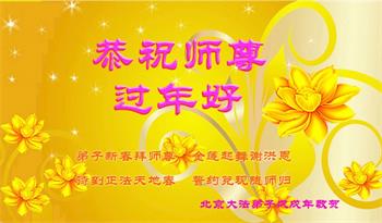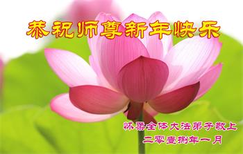 师父您辛苦了!过年好! 多么希望您早日回到中国大陆,弟子们想您啊。我们一定要按照师父要求修好自己,救度众生努力做好三件事,不辜负师父的慈悲苦度,精進实修! 北京丰台区马家堡三位大法弟子恭祝慈悲伟大的师父过年好!