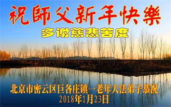 新的一年开始了,祝师父新年快乐!多谢慈悲苦度! 北京市密云区巨各庄镇一老年大法弟子恭祝 2018年1月23日 北京方庄地区大法弟子恭祝师尊过年好!