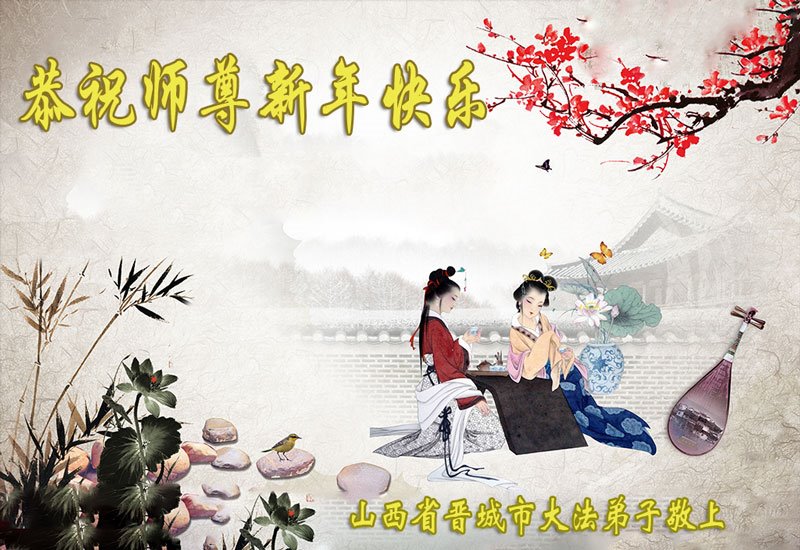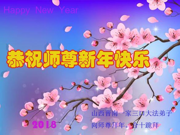 在师尊洪恩浩荡和慈悲保护下,我们乘法船悠悠,闯过逆风恶浪、踞炉炭上,走过邪恶的黑风孽海、乘风破浪。寒来暑往,苦浸梅凝,傲雪迎霜,渐入胜境。转眼间,正法救度又一春!值此二零一八新年来临之际,山西省晋城市大法弟子恭祝至高无上的师尊新年快乐!我们一定抓紧最后的时间,日日时时用心做好三件事,唤醒和挽救更多众生,不负师尊的慈悲苦度。山西省晋城市大法弟子合十跪拜! 定风波•谢师恩 爆竹声声辞旧元, 梅花朵朵迎新年。 遥祝师尊节日好, 叩首,慈悲救度法无边。 修炼大法志弥坚, 心虔,立掌当胸化金莲。 回首多年修炼路, 师护,救人不怠返家园。 山西省晋城市城区大法弟子恭祝慈悲伟大的师尊新年快乐!